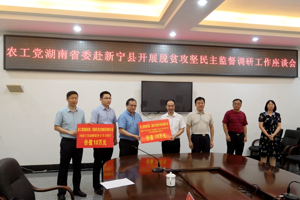 6月28日上午,对口帮扶新宁及脱贫攻坚民主监督调研工作座谈会在崀山国际会展中心进行,邵阳市人大常委会副主任、新宁县县委书记秦立军主持会议,县委常委、常务副县长谢小军介绍了新宁县开展脱贫攻坚工作的有关情况,张灼华介绍了湖南省脱贫攻坚形势和当前任务,勉励大家继续扎实推进工作,农工党湖南省委会将尽力开展相关的帮扶工作。秦立军表示将按照统一部署,全力冲刺,如期完成脱贫摘帽。新宁县政协主席蒋新雄、统战部长匡丽群,以及各相关部门负责人参加了会议。座谈会后举行了捐赠活动,湖南万信医疗科技有限公司、安徽贝克生物制药有限公司向新宁县捐赠了医疗器械、药品总价值80万元。
