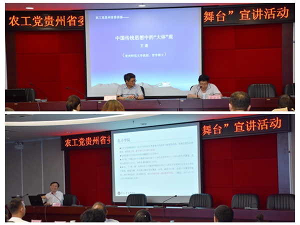 省委会理论与党史研究委员会副主任、贵州师范大学教授、哲学博士王进,省委会理论与党史研究委员会副主任、贵州大学副教授、管理学博士项凯标分别以“中国传统文化中的‘大体观’”和“新形势下产业转型升级与资本运作思考”为题作专题宣讲。