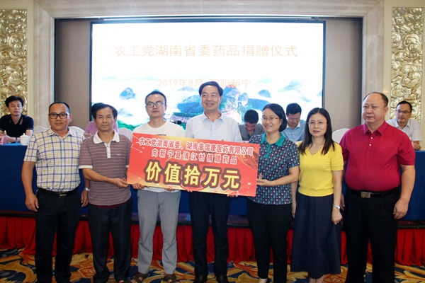 在捐赠仪式上,农工党湖南省委会及湖南普瑞康医药有限公司向新宁县清江村捐赠了价值10万元的常用药品。