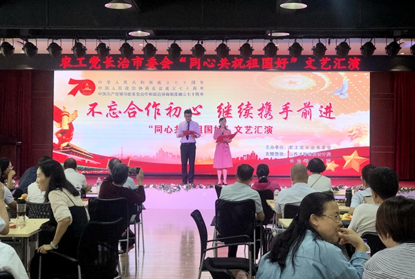 2019年9月8日,农工党长治市委会举办了“同心共祝祖国好”文艺汇演活动。农工党长治市委会主委刘鹏飞,市政协副主席、民革长治市委会主委焦吉林,农工党长治市委会原主委王世贺出席活动。中共长治市委统战部党派科科长石勇应邀参加。市委会副主委张丽芳、赵云斌、李红岩