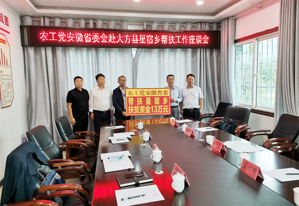 2019年9月16日至18日,安徽省政协副主席、农工党安徽省委会主委牛立文率领工作组一行前往贵州省毕节市大方县星宿乡,开展对口扶贫帮扶工作。工作组一行在星宿乡脱贫攻坚指挥部与该乡党政领导班子举行帮扶工作座谈会,中共星宿乡党委书记陈鹏汇报了该乡脱贫攻坚工作及帮扶项目实施情况,会上举行了农工党安徽省委会向星宿乡捐赠扶贫资金13万元仪式,与会同志在会上作了交流发言,介绍了两地在脱贫攻坚工作中的经验做法。