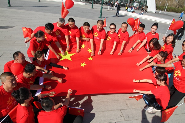 风和日丽、江水粼粼,参加活动人员换上定制的印有“我爱你中国”字样的红色体恤衫以“快闪”的形式共同奉献了一曲“我和我的祖国”。在巨大的五星红旗映照下,挥舞着手中的国旗,大家热情激荡、纵情歌唱,同时也引来无数游客的驻足赞扬!