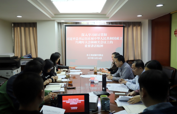 2019年10月14日,农工党成都市委会召开专题会,传达学习习近平总书记在庆祝中华人民共和国成立70周年大会和相关会议上的重要讲话精神。农工党四川省委会副主委、成都市委会主委甘华田主持学习。市委会副主委胡伟峰、秘书长曾琪出席会议。