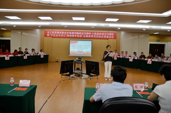 2019年10月20日下午,农工党东莞市委会举办的庆祝新中国成立70周年、人民政协成立70周年暨“不忘合作初心,继续携手前进”主题教育活动知识竞赛现场竞赛在东莞市行政中心主楼多功能报告厅举行,市委会副主委赫喜华主持了竞赛,副主委袁明杰、周柯参加活动。