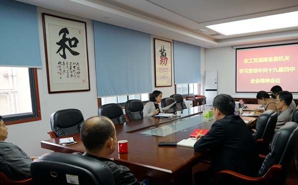 2019年11月11日,农工党湖南省委会机关召开会议,组织机关干部学习贯彻中共十九届四中全会精神,省委会专职副主委蒋秋桃主持会议并讲话。