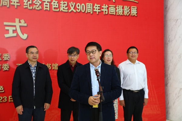 何玉庭代表区委会致辞。他指出,这次书画摄影展来到百色开展,旨在进一步推动农工党“不忘合作初心,继续携手前进”主题教育活动深入开展,以书画和摄影作品形式庆祝中华人民共和国成立70周年和纪念百色起义90周年,展望新时代多党合作事业发展的美好前景,继承和发扬百色起义百折不挠、奉献拼搏、团结务实、争先创新的宝贵精神,激励广大党员切实担负起建设新时代中国特色社会主义的历史使命。