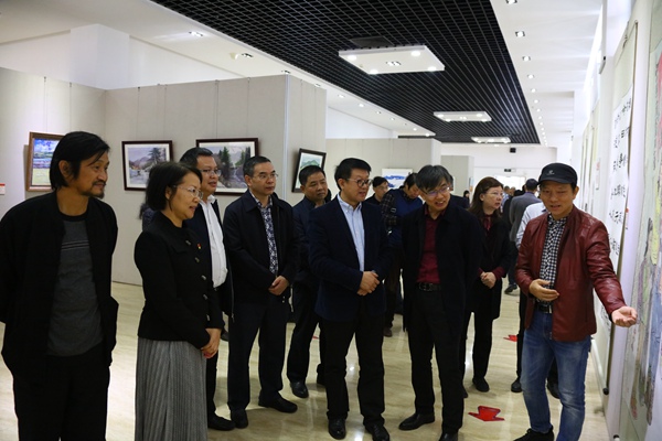 仪式结束后,出席活动的领导、来宾和社会各界群众一起兴致勃勃地参观了书画摄影展。农工党广西书画院常务理事、农工党百色市委会机关干部以及农工党百色市基层组织的党员同志们一起参观展览。(农工党广西区委会)