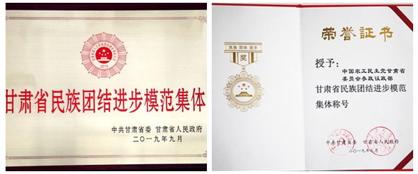 2020年1月14日,中共甘肃省委、省政府表彰了甘肃省民族团结进步模范集体和先进个人。为激励和动员全省上下积极参与民族团结进步创建工作,促进全省民族团结进步事业不断创新发展,省委、省政府决定,授予中国农工民主党甘肃省委员会参政议政部等92个集体为“甘肃省民族团结进步模范集体”。据悉,省委会获此殊荣,是全省统战系统2个获得先进集体的组织之一。