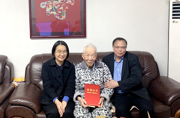 2020年1月16日上午,农工党湖南省委会主委张灼华一行冒雨到中南大学湘雅医学院,看望慰问老党员代表、省委会原副主委、97岁高龄的李学渊,并送上新年祝福。