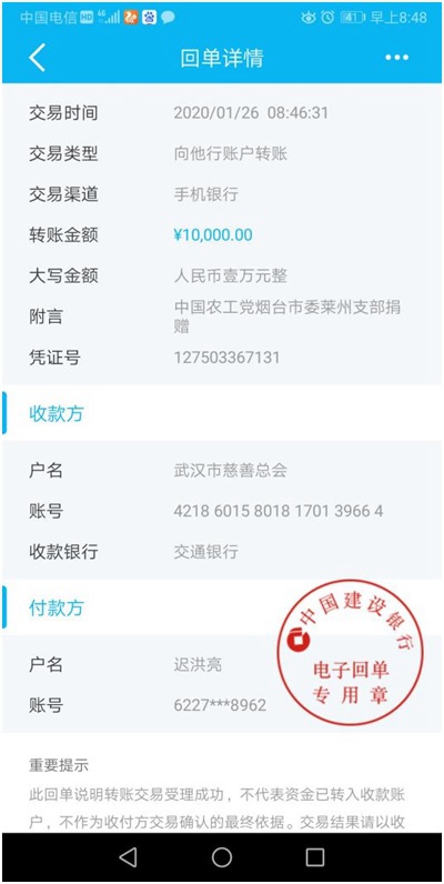 刘泽铭,山东省政协常委、农工党烟台市莱州支部在支部主委。1月26日,在他与副主委李学香的倡导下,24名党员向武汉市慈善总会捐助了一万元特殊党费,涓水细流,星火微光,这是一份农工党员为支援武汉抗击疫情奉献一份深情,是对祖国平安的祝福。