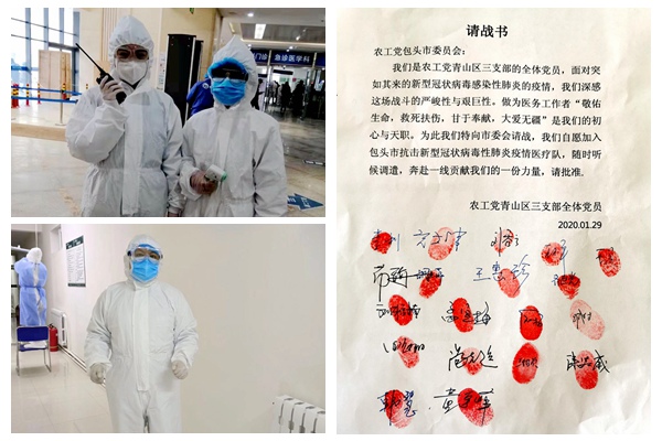 农工党青山区第三支部全体党员,面对突如其来的疫情,在抗击疫情的请战书上郑重的签上了自己的名字,积极参与疫情防控工作。简短而有力的誓言,显示了打赢疫情防控阻击战的信心和决心。他们中间,有担任我市疫情防治蒙医中医专家指导组组长、深入疫情一线参与会诊患者的包医二附院副院长布赫巴雅尔,有包医二附院院级抗击新型冠状病毒肺炎专家组成员高文伟、孟宪梅、李冬梅,也有在一线发热病房工作的高秉勋等党员,他们都在各自的岗位上共克时艰,成为了疫情防控一线的最美“逆行者”。