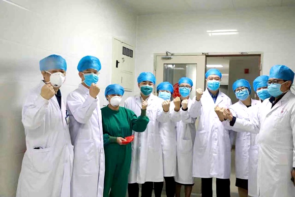 李雪松(左四)和惠州市第三人民医院感染科医护人员一起互相加油打气