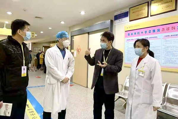急诊科主任于晓钧(左二)与医院领导在一线现场研究疫情防控工作