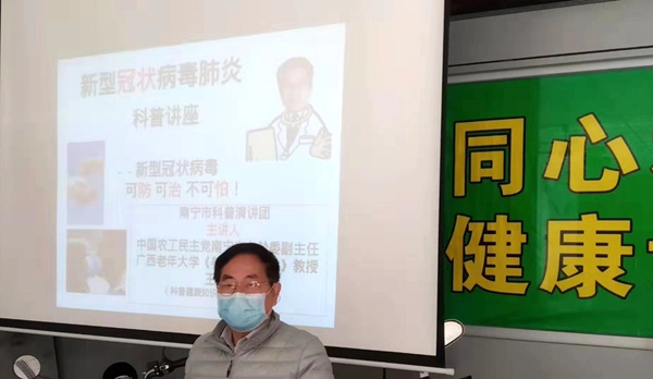 新型冠状病毒肺炎疫情当前,针对社区居民中还有部分群众因为对病毒认识不够从而导致的防护意识不强、重视程度不够、存有侥幸心理等情况,农工党南宁市三医院支部退休党员王绍威主动放弃了春节与家人团聚的机会,专门就“新型冠状病毒肺炎知识”进行了一场“空场”讲座。希望通过这样的尝试,使社区群民知道“新型冠状病毒可防、可治、不可怕”,让大家不信谣、不传谣,以积极的心态正确应对“疫情”,众志成城,争取早日打赢这场“没有硝烟的战役”。