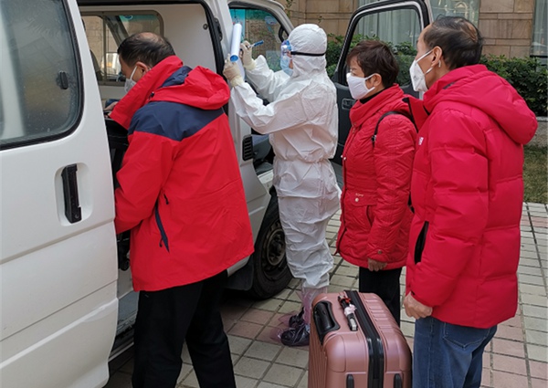 张成梅(左2)转送新冠确诊病人的密切接触者,并做信息登记