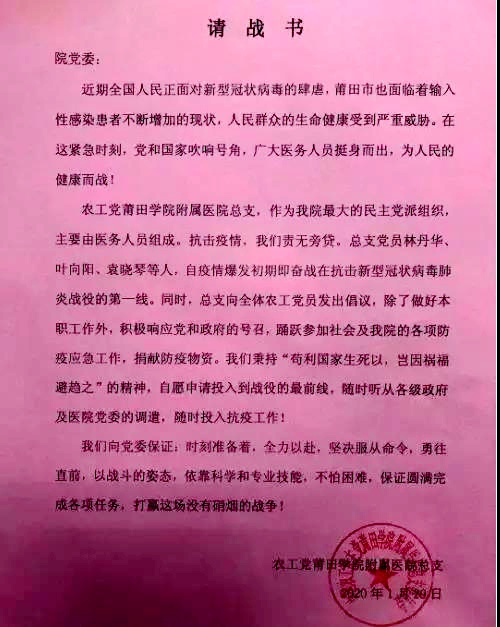 莆田学院附属医院总支递交请战书