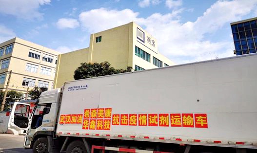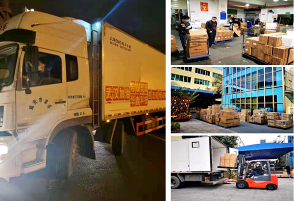 接到湖北办事处的物资紧急要求后,华鑫科技疫情应急小组在领导的协调下,迅速行动。根据武汉地区物质的储备情况及需求,分头联系物流,确认出仓货物,打包分装。但是,由于春节假期及疫情的原因,前往武汉运力紧张,华鑫科技决定出动自备车队,由总经理带队运送物资前往武汉疫区,公司运输部当即有四名员工主动报名参加运输,考虑到疫区的封闭管理及交通管制,同时最后应急小组联系上了一辆返程的陕西籍大货车。于是,公司整个职能部门连夜运转,将近二百万的医疗物资打包装车,星夜出发,奔赴武汉疫区,经过十四个小时的连续奔波,物资顺利由广州抵达武汉,彻夜未眠等待物资的华鑫科技湖北办事处的员工接力分发给各用户,补充武汉及湖北地区用户仪器的试剂需求。同时,迅速将医疗机构急需的仪器设备安装、培训并及时地展开工作,为诊断、救治新型冠状病毒肺炎患者发挥作用。