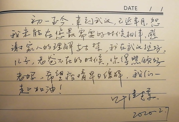叶继辉在家书中对妻子和儿子说:初一至今,来到武汉已近半月,恕我未能在您最需要的时刻相伴,感谢家人的理解与支持,我在武汉挺好。儿子,老爸不在的时候,你得照顾好老妈,希望疫情早日缓解,我们一起加油!