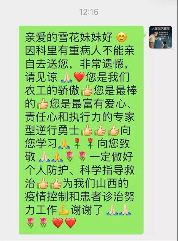 农工党山西省委会常委、山西白求恩医院主委,山西白求恩医院全科医学科主任冯玫因病房患者急救,未能亲自送行,但对她的惦记、嘱托牵挂于心,给予了她极大的信心和动力。