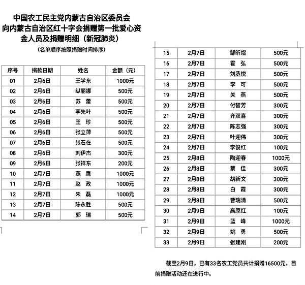 截至2月9日中午,区委会收到33名同志,包括区委会机关全体同志和部分党员的捐款,共计16500元。区委会第一时间将捐赠款代转捐赠到自治区红十字会,捐赠用于“内蒙古自治区抗击新型冠状病毒感染的肺炎疫情”。目前,捐赠活动还在进行中。