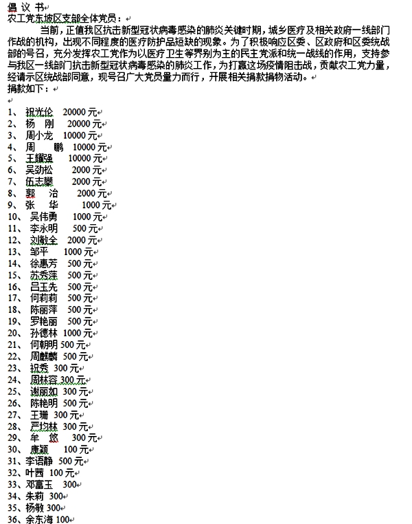 一方面,农工党四川省眉山市东坡区支部积极组织党员中的医务工作者发挥所长、坚守一线、勇挑疫情抗击工作重担,支部副主委窦树林,党员陆光兵、李珂、陈福、卢爱琼、朱莉等12名医务工作者已连续奋战和坚守在抗疫一线近20天,每天工作时间长达10多个小时。一方面,为做实做好支持和配合共同抗击疫情工作,农工党眉山市东坡区支部在第一时间即向全体党员发出《倡议书》,倡议、鼓励非医务工作者党员为抗击疫情捐款捐物、奉献爱心,得到广大党员的积极支持和充分响应,其中,支部主委祝光伦带头个人捐款2万元,党员杨刚个人捐款2万元,党员周小龙、周鹏、王耀强分别捐款1万元,党员吴劲松、伍志攀、郭治、张华、吴伟勇等同志纷纷慷慨解囊、踊跃捐款。截至2020年2月10日,党员捐款人数达到36人,党员个人捐款总额已达到9.05万元。据悉,捐款将全部用于抗击疫情一线工作,以确保专款专用、善款善用、严格监督。(伍志攀)