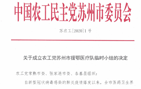 2月10日晚,农工党苏州市委会、农工党苏州常熟市委会在武汉成立了只有3名党员的援鄂医疗队农工党临时小组, 是全省首个在武汉抗疫一线成立的农工党临时小组。