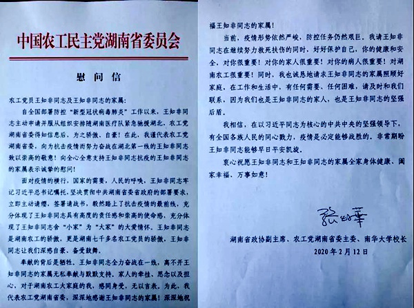 防控“新型冠状病毒肺炎”工作进入攻坚阶段,湖南省政协副主席、农工党湖南省委会主委、南华大学校长张灼华给张乃文、邓建斌、凌芳、罗亚、彭天冰、雷建华、廖佳颖、王知非、刘佳、喻俊、陈智敏等11名援鄂农工党党员及其家属发去慰问信,并委托农工党株洲、邵阳、益阳市委会和湘雅二医院总支、湘雅三医院支部和省财贸医院支部看望慰问辖区或支部的党员家属。