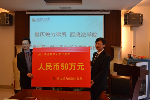 2014年11月25日上午,重庆锐力律师事务所向西南政法大学法学院捐资助学协议签订仪式暨首期“锐力助学金”颁发仪式在西南政法大学法学院会议室隆重举行。农工党江北区科技支部副主任、重庆锐力律师事务所主任李建刚,西南政法大学法学院院长唐力教授、法学院党总支书记梅传强教授出席捐资仪式。仪式由法学院党总支副书记鲁琴副教授主持。