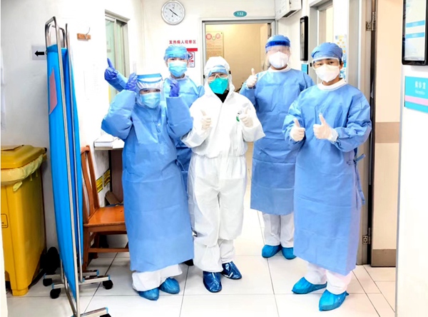 王妤护士长(右二)和医护人员一起加油打气