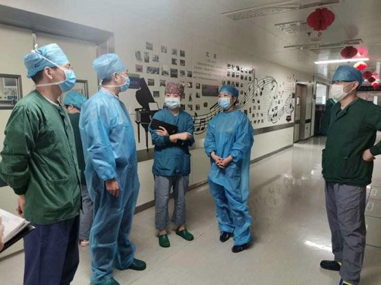西安交通大学第一附属医院是陕西省新冠肺炎确诊患者定点收治医院。因为是新的疫情,医院需要从空间、设备、人员、流程、横向及纵向等方面做大量的协调工作,并对疫情发展做出科学预判,从而满足疫情外溢增加患者救治的需求。从刚开始腾出一个专用发热病房,到把整个感染科腾空,再到又拓展出两个区域,形成符合规范的一个环状区间,他一步也没有离开过工作岗位。虽然医院组成了以传染科、呼吸和重症科为核心的团队,但面对从开始的新冠肺炎省级定点收治医院到危重症、孕产妇幼儿收治医院、再到外籍人士定点收治医院不断升级的任务,需要不断换转相关联专业医护人员,他遂机作出收缩一般战场,强化主战场,有序有限开放门诊的调整,通过预约来满足一些危重症特别是肿瘤患者的救治需求,把主要力量投入到新冠肺炎防治。同时,组建多个重症救治战斗小分队,保证每一个新冠肺炎病人收治后,能够在第一时间得到有效治疗,突出了主战场,实现了“平战”结合。疫情防控工作中的专业高效的组织能力是放大优质医疗救治资源重要的方法之一,为做好诊治过程中分诊、确诊、治疗等各个环节的流程、标准、规范,严防在高危、高密度过程中出现新的感染和扩散,避免医务人员感染,他每天都会不厌其烦地检视重点环节和区域,和同志们商定讨论处理发现的问题,对可能出现的问题提出预案。时刻关注危重病人,及时和专家组共同制定治疗方案。对观察和确诊病人因民族、年龄等因素对饮食的特殊需求都予以具体指导。