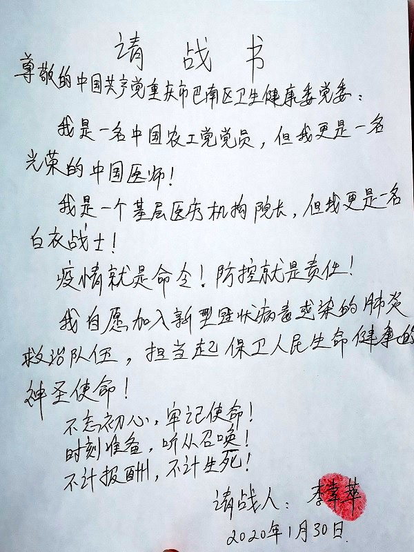 “我是一名农工党党员,但我更是一名光荣的中国医师!”“我自愿加入新型冠状病毒感染的肺炎救治队伍,担当起保卫人民生命健康的神圣使命!”巴南区农工党党员李幸萃同志在请战书中这样写到。