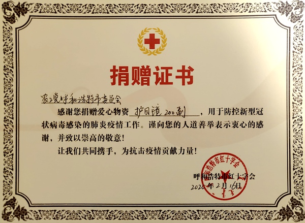 2020年2月16日,农工党呼和浩特市委会向呼和浩特市红十字会捐赠200副护目镜,为一线医务工作者提供安全保障,助力打赢疫情防控阻击战。