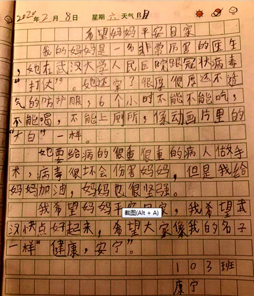 面对家人,总是坚强不起来。我们向远在老家的父母亲隐瞒了一切,相隔千里,老人家当然不知道我们现在面临的危机。女儿很懂事,跟我一起隔离在家,为此,刚上一年级的女儿还专门为妈妈写了一篇短文,为妈妈加油。