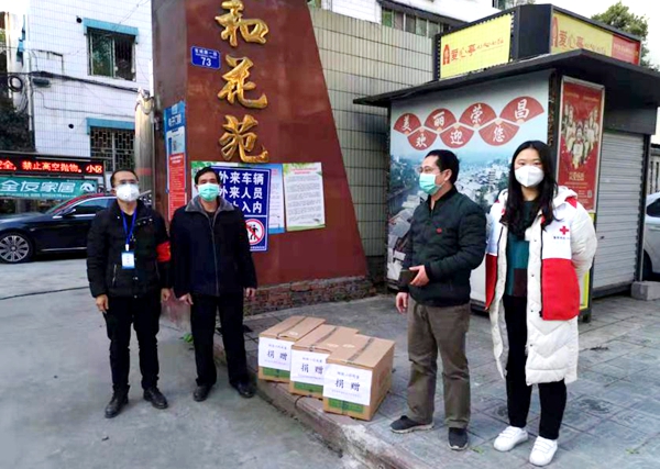冯太国(左一)到荣昌区怡和花苑小区为居民群众发放生活物资