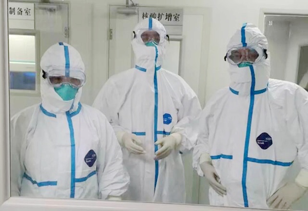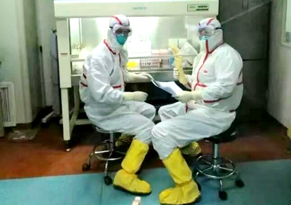 天水市疾病防治控制中心的农工党党员王剑虹、许欣、张勇、刘水、高雅玲奋斗在抗疫一线,对送检样品进行认真检测。