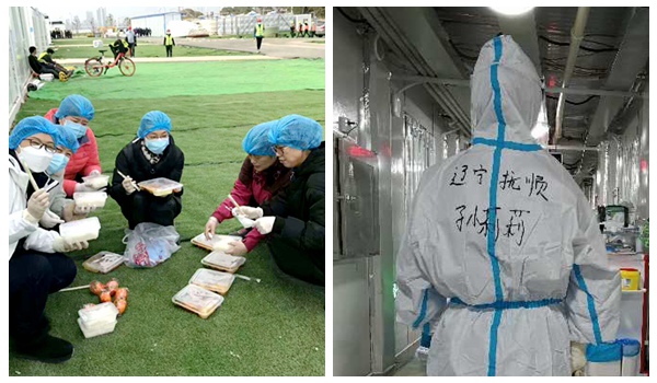 由于雷神山医院病区处于边建设边收治患者的紧急状态,2月13日,队员们去病区实地查看设施情况、熟悉流程、办公环境和计算机操作系统。当看到两辆大卡车的物资送到病区时,大家不分男女,肩抗背抱的搬运物资。等所有的物资搬进病区后,大家才端着盒饭,伴着星星在室外的草坪上席地而坐吃晚饭,没有一个人叫苦叫累,回到酒店已经午夜。