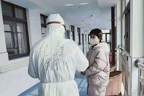 定点医院里病人不断增加,纪鑫医生从开始管一间病房,到后来管一层楼的患者。一个班八个小时,基层医院防护用品缺乏,他不喝水,不上厕所,一边节省着防护服,一边温和耐心的为病人服务。哪怕汗流浃背,虚脱乏力,也尽心尽力做好每一件小事。他主动帮志愿者搬运物资,给独自隔离的张阿姨端饭倒水,安慰年轻的疑似患者小李的情绪,叮嘱护士切实做好自身防护工作……一天天的相处,病人都很喜欢这个年青的小伙子,很快就建立了信任,医治起来也非常配合。