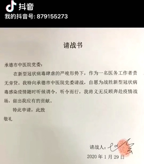 新冠肺炎疫情发生伊始,承德市中医院护士长赵宾就第一时间递交了赴鄂请战书,作为2019年新入农工党党员,她政治觉悟高、党性强,面对抗击疫情使命召唤,她两肩虽柔弱却勇于担当。2020年2月19日,赵宾作为承德市第三批赴鄂抗疫医疗队成员,前往湖北疫情防控一线开展医疗救助。