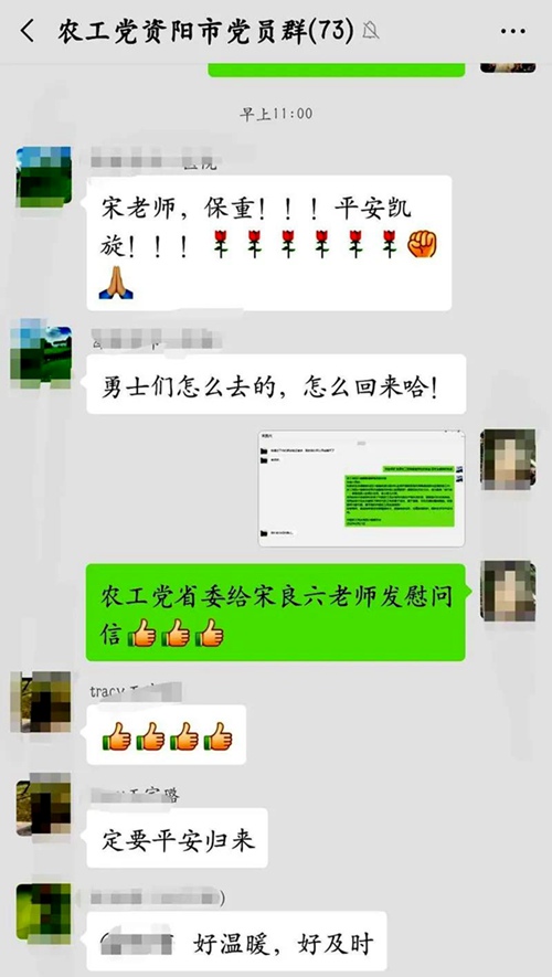 得知宋良六同志出征,农工党四川省委会即刻联系他,以微信方式转发了省委会的《慰问信》,向他表示诚挚慰问并致以崇高敬意,感谢他的无私付出,成为最美“逆行者”,希望他发挥精湛技术,圆满完成任务,注意自我防护,早日平安归来!资阳市总支的党员们纷纷点赞,为宋良六送去平安祝福,为省委会的极速飞信问候倍感温暖。