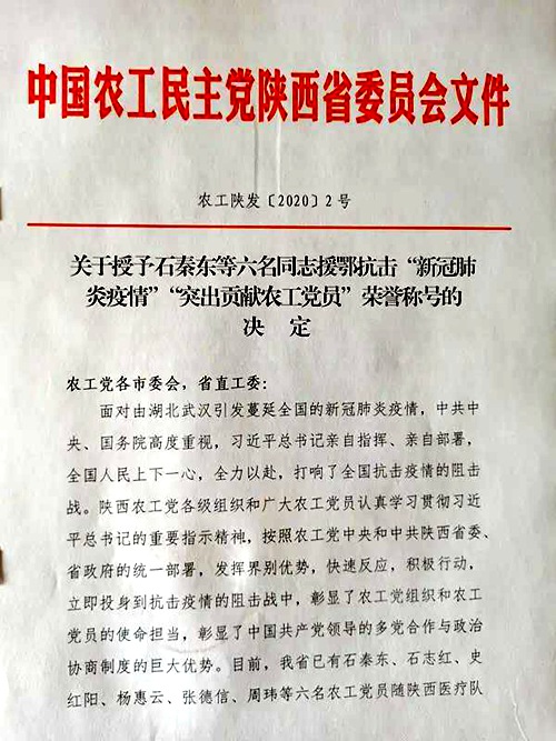 目前,陕西省已有石秦东、石志红、史红阳、杨惠云、张德信、周玮等六名农工党党员随陕西医疗队驰援湖北,他们同其他医务工作者一起不畏艰险、挺身而出、逆行而上、勇挑重担,夜以继日的用自己的生命保护着广大患者的生命,奋战在抗疫驱“敌”的最前沿,奋战在抗击新冠疫情的最前线,他们是农工党组织的光荣,是农工党党员的楷模,是抗击新冠疫情的勇士,是和平时期的英雄。