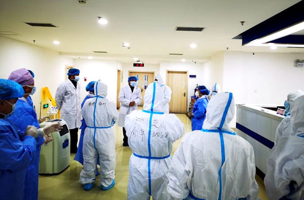 随着疫情的发展,在县委、县政府高度重视下,英山县人民医院迅速改造了国医楼,明确了新冠肺炎患者收治的确诊病例区、疑似病例区、留观病例区三区模式。设立共计九个治疗病区加一个发热门诊,三个预检分诊点。每个病区和每个预检分诊点的建立、人员的培训与调整、工作流程的建立与调整、制度的落实,赵茂林都亲自参与,每一天他都忙碌的穿梭在这些最危险的地方,对三个区域的病人他都了如指掌,随时关注每一例病人的病情变化。他制定了严格的病情讨论制度,每天上午十点,是他们固定的新入病人和疑难病例、危重病例的讨论时间,由专家组共同商定治疗方案。每天下午是第二天出院患者的病情讨论时间,确定是否出院和出院医嘱。所有治疗效果不佳或病情较重的他都会亲自查房,带领相关科室专家到病房,询问和体检,及时讨论治疗方案。