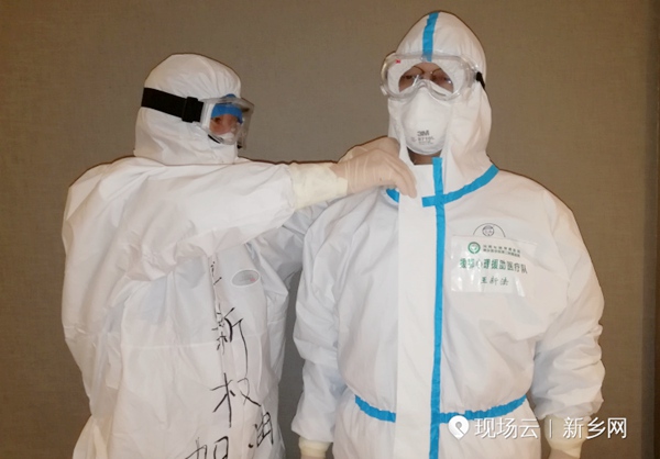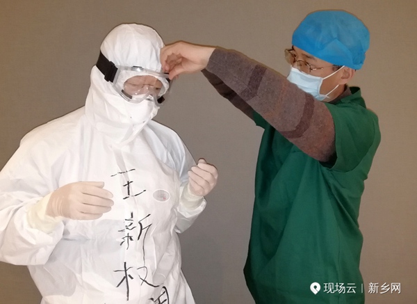 弟弟王新法帮哥哥王新权整理防护衣