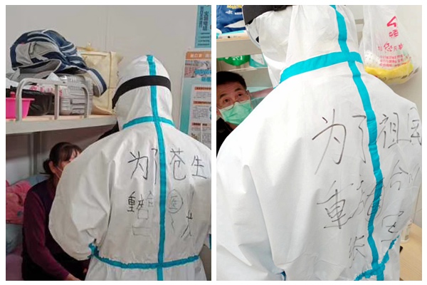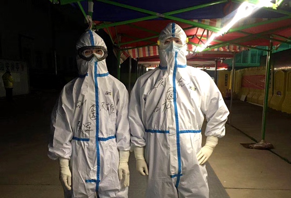 沌口方舱医院是新建的方舱医院,能容纳1000人。因为同是重庆合川去的,同为农工党党员,后来又分到同一个小组,两人为自己的小组取名为:农工二人小分队。进舱的时候,两人分别在防护服背上写上:“为了祖国”、“为了苍生”。