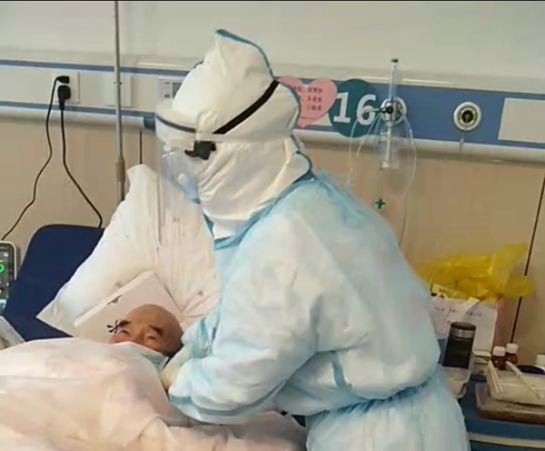 16床的爷爷我记得他来的时候情绪很不好,还拜托我给他家里人打电话,要家里把他接回去。我给他喂药他说不吃,他自言自语的说“治不好咯,你们别白费力气了”,“爷爷,您要相信我们,更加要相信自己,一定会平平安安的”我强忍着眼泪对爷爷说。后来的那几天,爷爷情况一天不如一天,那天我值晚班爷爷发热到39℃,呼吸都不那么顺畅氧饱和度也开始下降,当班医生立即做了进一步对症治疗;吃了退热药后爷爷的体温也慢慢开始下降,我给爷爷倒好开水叮嘱他多喝温热水,给他监测体温及时更换被汗液渗湿的毛巾,为他热饭,给他补足能量,早点战胜病毒。我下班后这位爷爷被转到了ICU接受最精密的治疗,只要空下来我都会为爷爷祈祷,祈祷他能平平安安的回家。后来通过腾讯视频看到爷爷转出了ICU 的视频,并当着医生的面把他偷偷写下的遗书撕掉了,还跟医生保证“他要坚强的活下去”,那一刻所有医护人员脸上都露出了灿烂的笑容,竖起大拇指为爷爷加油!