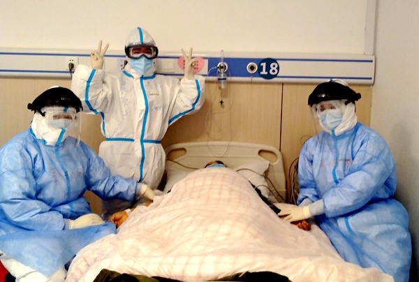 当天晚上,我们就随省医疗队来到黄冈市英山县。车队进入英山县时一排排警察齐刷刷的向我们敬礼,此情此景,深刻铭记!英山县的紧张培训为我打下了坚实的基础,2月25日我们医疗队分配到--黄冈大别山区域医疗中心,成为湖南二队一名护理人员,做着既熟悉而又陌生的工作--熟悉的是做着同样护理工作,陌生的是护理新冠病人需要做好层层防护穿着好几层厚厚不透气的防护服。上第一个大夜班就体验了一次个大工程项目,因为除了照常要查房、翻身、喂鼻饲、测血压体温外,还有11个抽血化验,取7个咽拭子,5个动脉血气分析要做,其实这些操作我并不是第一次做,根本难不倒咱们,为什么要说是大工程呢?原来不同的是现在要披着这身“盔甲”去病房为病人做治疗,我不是第一次戴手套操作,却是第一次戴着三层手套抽血、抽动脉血气等操作,感觉整双发麻的手拿着抽血试管都没有丁点知觉,而到了考验我真正技术的时候。这次操作虽然看起来有些滑稽,左摇右摆的就像只大企鹅,最后还是高标准完成了大工程。虽然此时已是汗流浃背,鼻涕和汗水被迫吞进了胃里。但心情是无比激动,是的,我已经快速融入了这个战场,适应了一切。接下来我将和所有战友们一起携手歼灭病毒,争取早日结束疫情。看着病人病情一个接一个好转,心里像是掉下一块沉甸甸的石头,下面这3位患者给我留下了深刻印象,他们都是非常坚强的人。