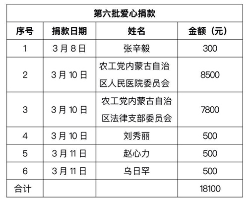2020年3月16日,农工党内蒙古区委会向自治区红十字会捐赠第六批52位党员爱心资金,共计18100元,用于新冠肺炎疫情防控工作。捐款明细如下。