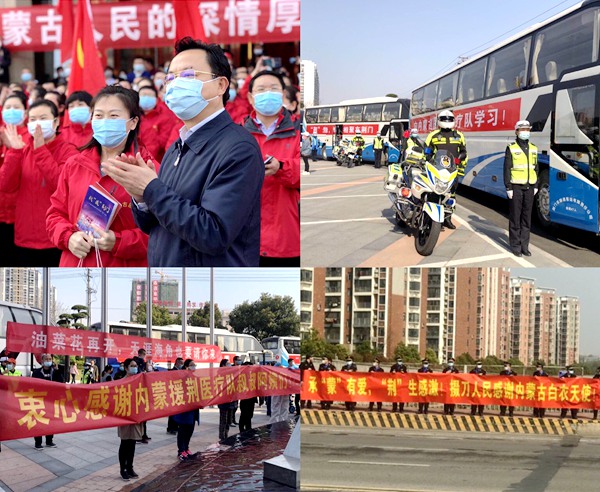 2020年1月28日,内蒙古首批医疗队来到荆门开展援助抗击疫情医疗救治工作,经过50多天的奋战,荆门疫情防控工作取得阶段性胜利,以累计管理患者1025人、累计护理患者1174人、累计治愈出院774人、累计培训医务人员2231人,零感染的优异成绩完成使命,平安凯旋。