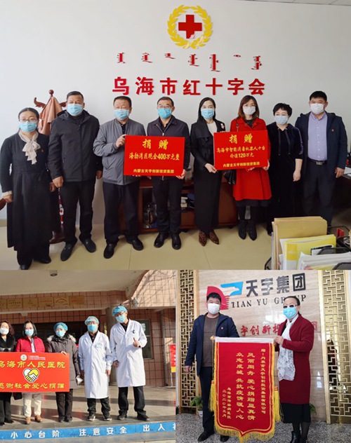疫情期间,内蒙古天宇创新投资集团先后向乌海市红十字会捐赠价值120万元的10台智能干雾消毒机器人、乌海市海勃湾区红十字会捐赠400万元现金、农工党乌海市委会捐赠现金10000元、内蒙古北京商会捐赠现金10000元、蒙信小区捐款16000元、口罩1000个、测温枪1把,捐赠善款物资累计549万元,为助力打赢疫情防控阻击战彰显农工党党员企业家的责任和担当。