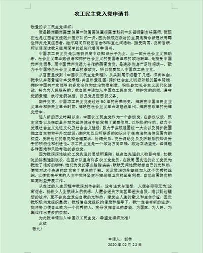 在援鄂一线紧张的医疗救治工作中,郭林切身体会到农工党组织的凝聚力,亲眼见证了农工党党员的奉献精神和坚强战斗力,深刻感受到农工党党员舍家为国、全力奋战的决心和勇气!于是,他郑重地写下入党申请书。