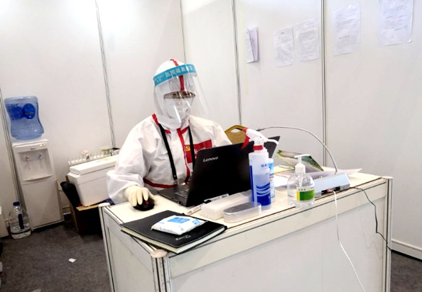在新国展入境人员集散点防控前线,钱惠影就迅速进入了“战时”状态,发挥自身院感防控特长,开展针对性的院感防控培训,参与制定工作流程,协助指导工作人员进行个人防护、清洁消毒、转运等相关工作。
